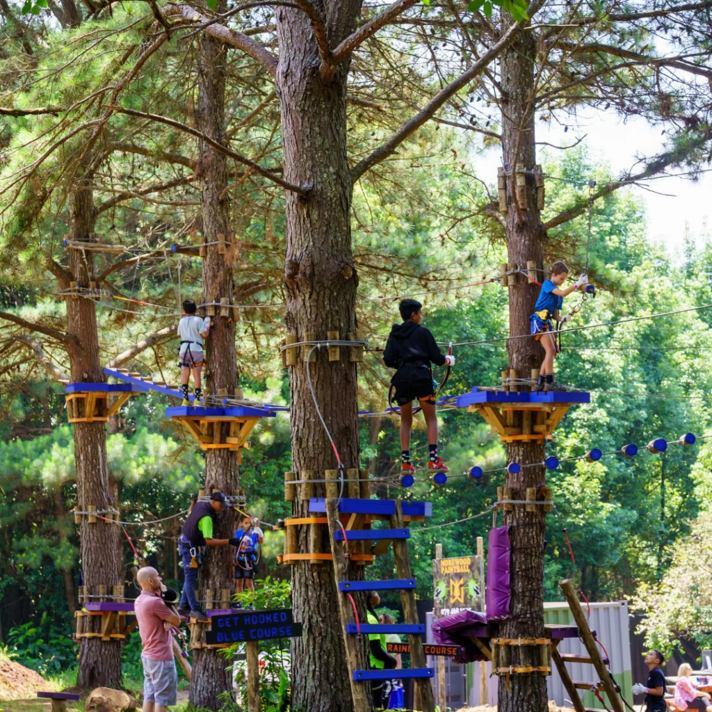 • Monkey Moves Course (Beginners Course): Beginner-friendly obstacles for younger children (7 yrs.+) & adults. Recommended for those new to treetop adventures.