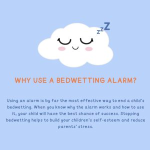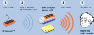 A sensor is placed in the child’s underwear and as soon as moisture is detected it sounds the alarm which then wakes the child. After a while the brain starts to associate the sound of the alarm with a full bladder and rather than releasing the bladder the child holds on and can wake up and then go use the toilet.