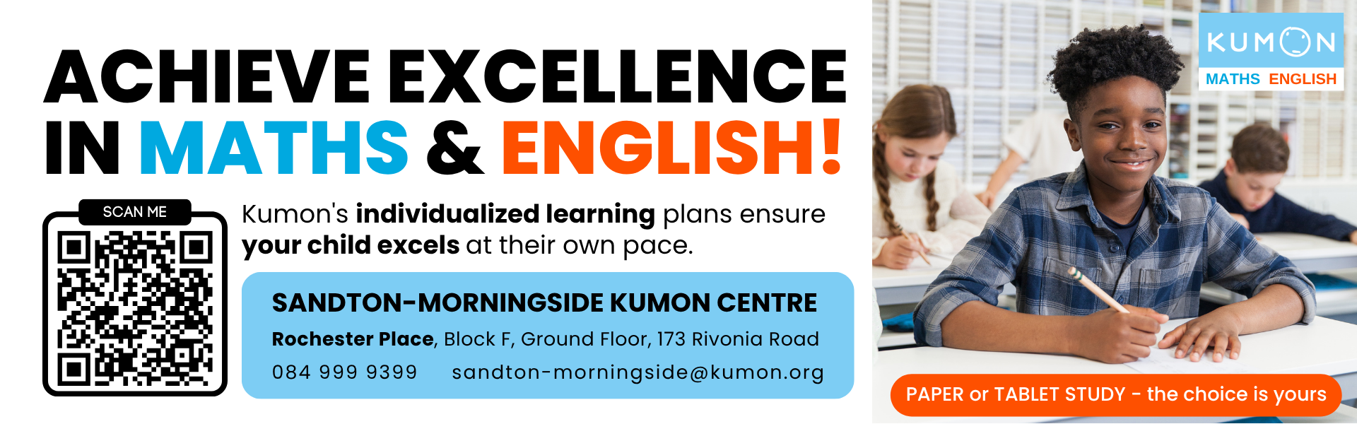 My centre welcomes students of all ages from 3 years old to adults. We have paper or tablet-based study. We are situated in the heart of Morningside, Sandton at Rochester Place (Entrance in Rivonia Road), Block F, on the ground floor with ample, secure parking and access control.