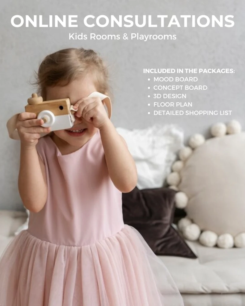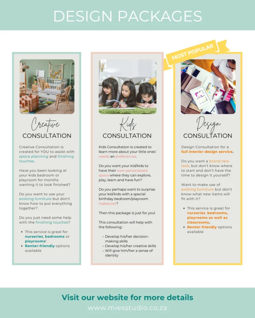 We offer convenient, personalised design solutions for nurseries, bedrooms and playrooms, all tailored to your child’s age, your family’s lifestyle and your budget. With three design packages to choose from, you can select the one that best fits your needs. Everything is done online, making it easy to get a professionally designed space no matter where you live or how packed your schedule is.