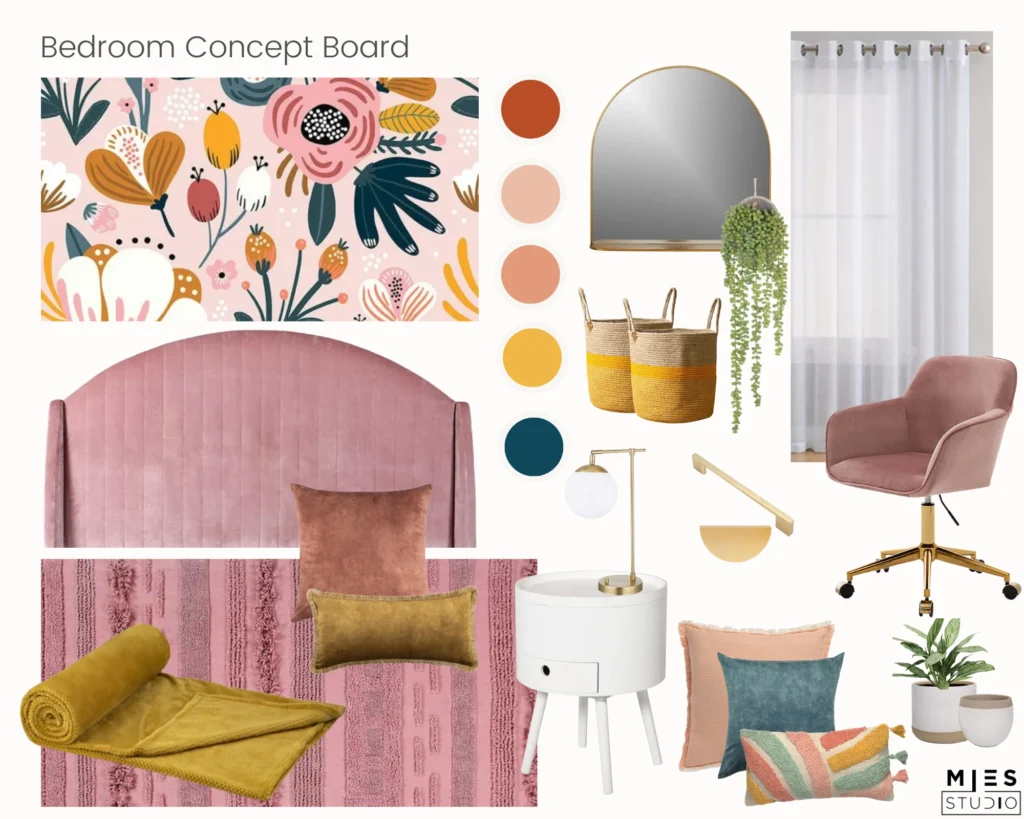 A visual collage of colours, textures and inspirational items to set the tone and feel of the room.