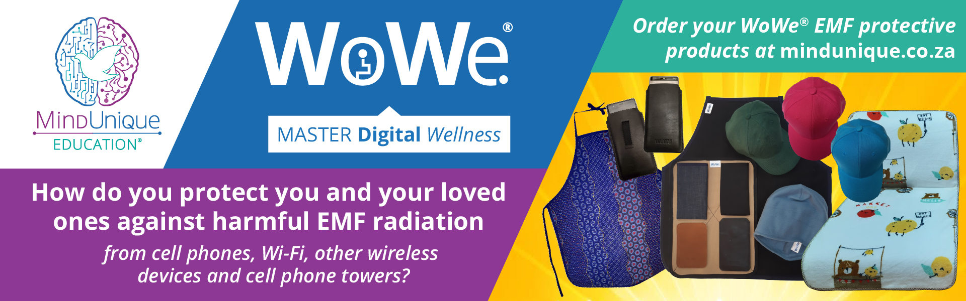 We offer WoWe® EMF protective products to protect your health by reducing your absorption of harmful, manmade EMF radiation, coming from e.g., Wi-Fi, cell phones, towers, and smart wireless devices.