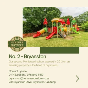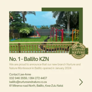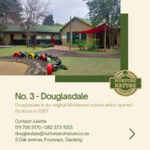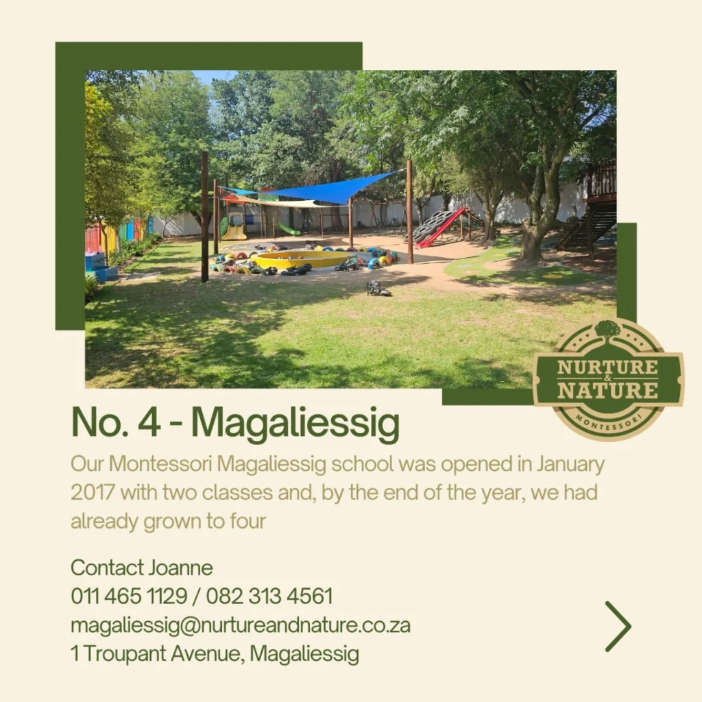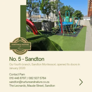 Nurture and Nature Montessori Preschool proudly operates five schools, offering an integrated, inclusive, and highly personalised educational environment for children aged 18 months to 5 years. Each class is thoughtfully designed to meet the unique developmental needs of the age group it serves. As a recognised member of the South African Montessori Association, we uphold the highest standards of Montessori education.