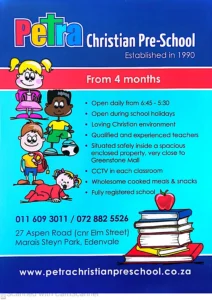 We take children from 4 months to 6 years.We are fully registered with the Department of Education.Our staff love working with children and are experienced/qualified/studying. We are situated in a safe,en-closed area with a camera at the gate and have CCTV in all the classrooms. We have a spacious play area. We have various extra-murals. We provide a healthy break-fast and mid-morning snack as well as a cooked lunch. We are open during all the school holidays and offer a holiday programme, except for during December.We offer a loving Christian environment.